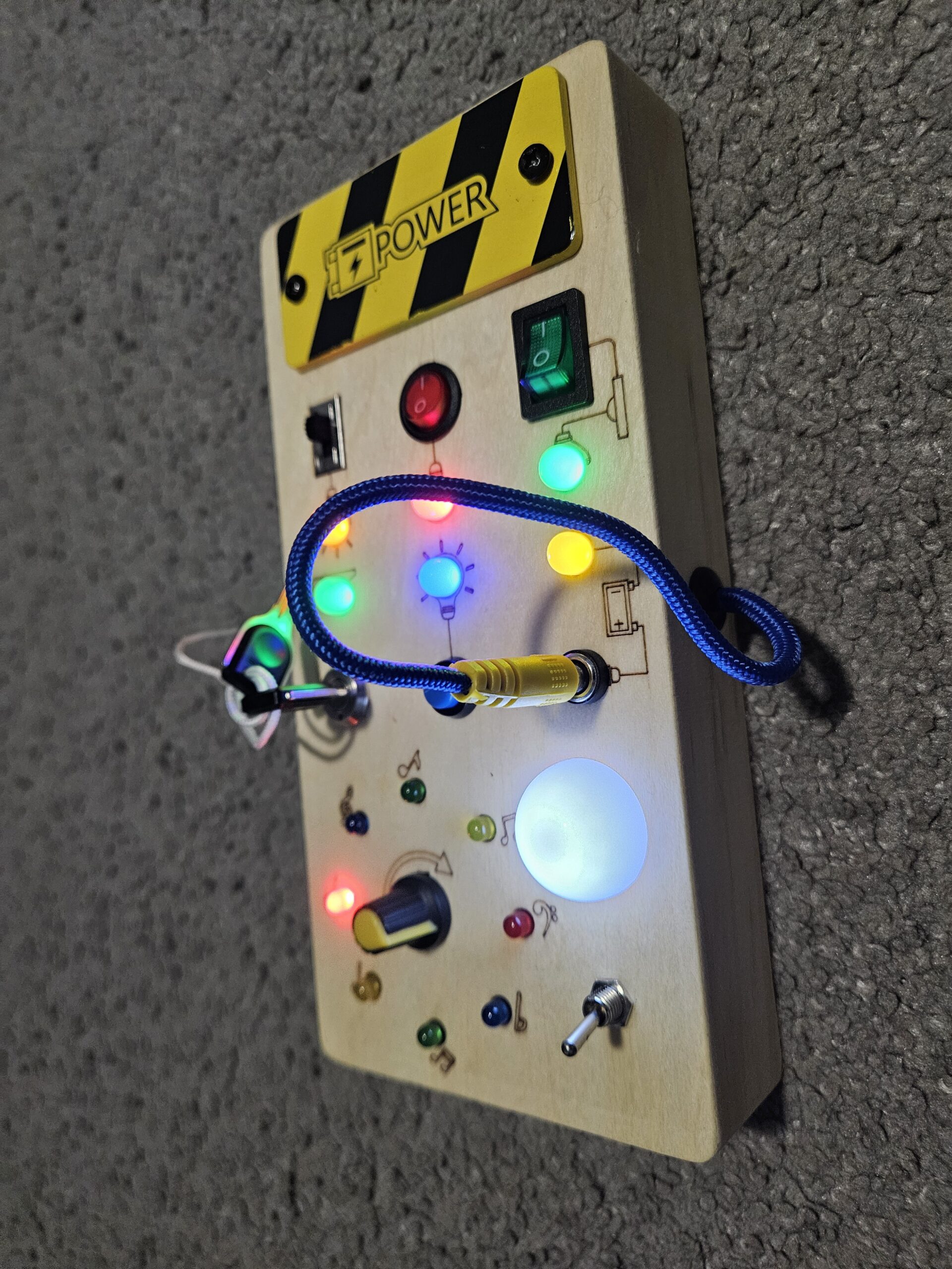🔹 🖲️ Echte Schalter und Knöpfe – Verschiedene Arten von Schaltern, Druckknöpfen und Drehreglern laden neugierige kleine Hände zum Entdecken ein.